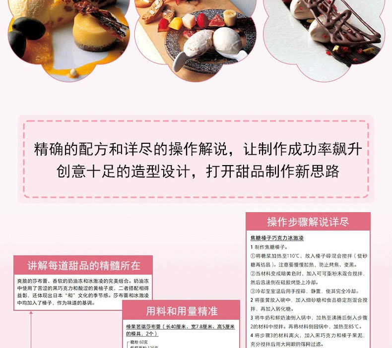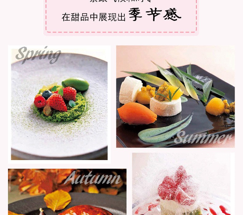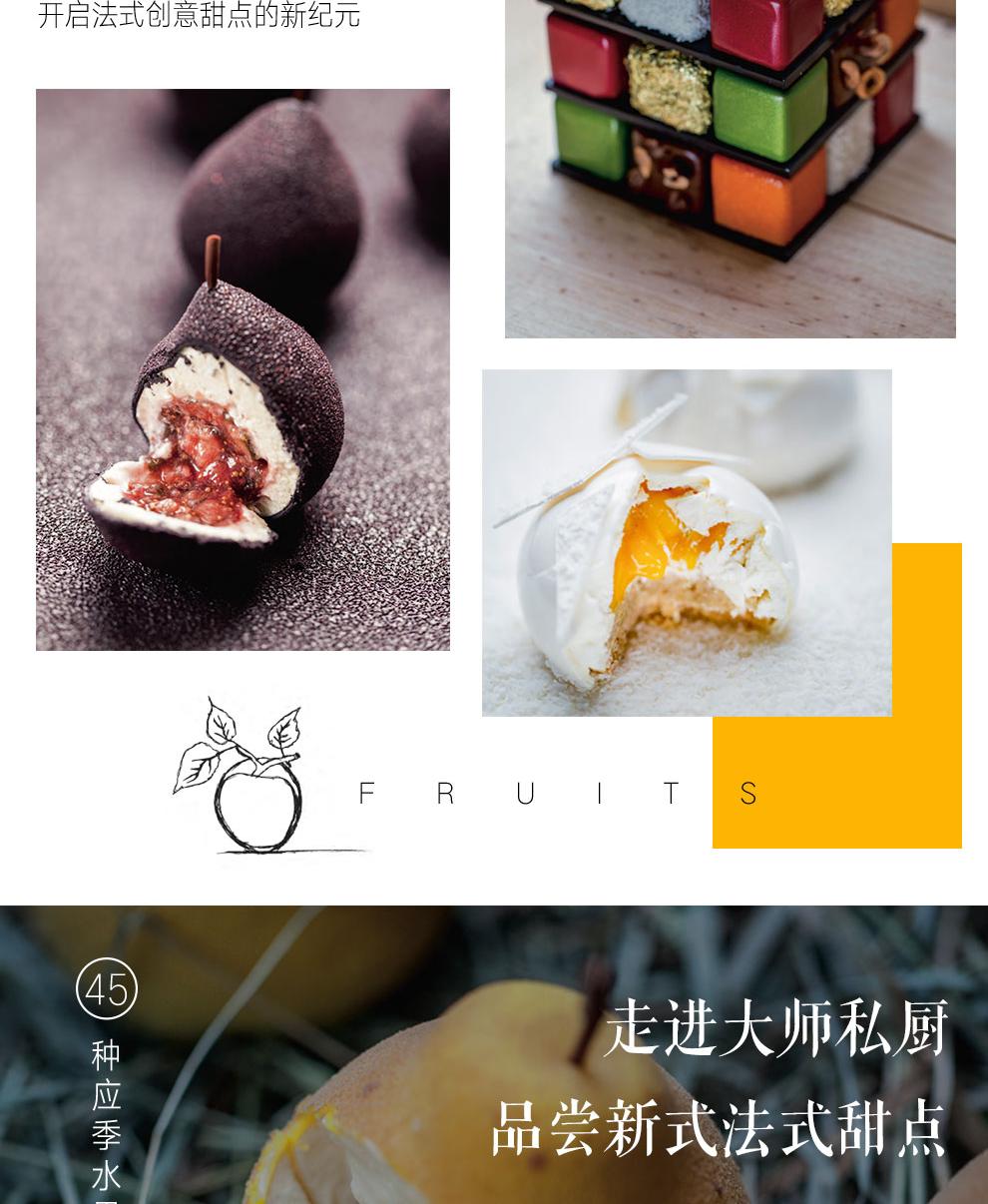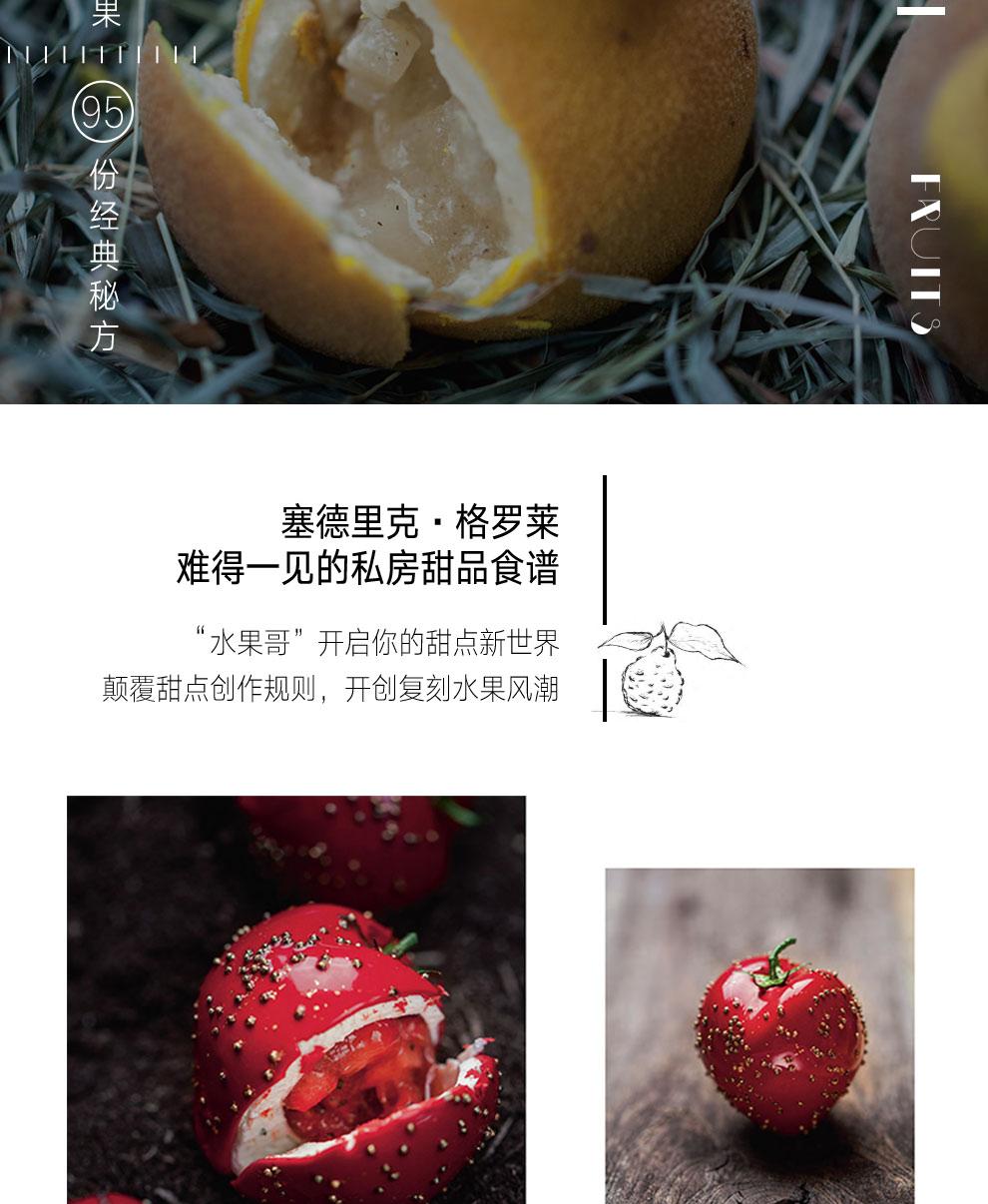 《水果進行曲 塞德里克·格羅萊的甜品創意法》中的“現代”系列甜品從大自然汲取靈感,避繁就簡,讓水果甜品的味道和質地達到了完美的契合。作者塞德里克將水果作為甜品創作的中心,這種甜品理念開創了法式創意甜點的新世界。這是一個方向性的徹底轉變,定義了全新的甜品製作方式。