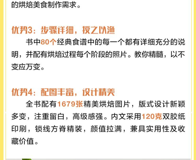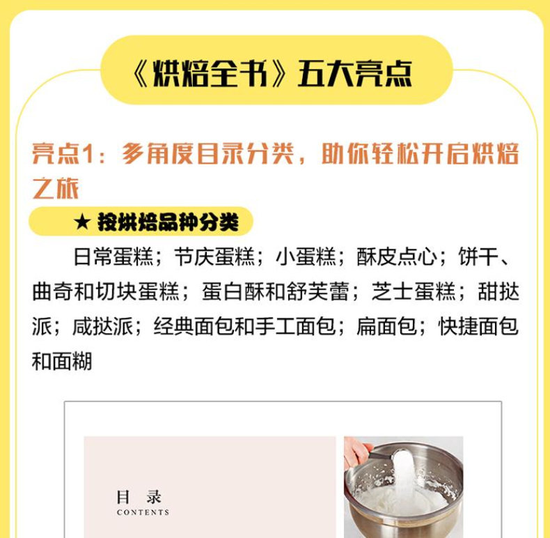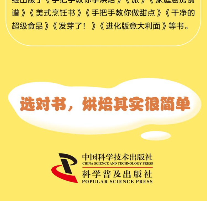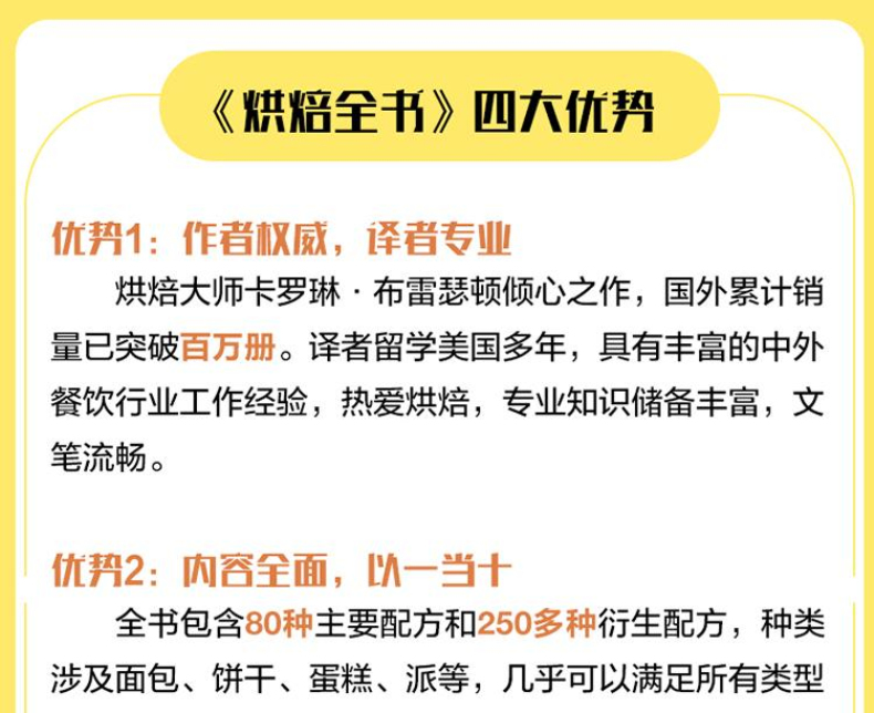 本書是經典烘焙和現代Z愛的指南,不只是告訴你該做什麼,而是向你展示拍打和折疊的區別是什麼,「軟峰」應該是什麼樣子,怎樣做酥皮。在烘焙的時候,知道指示的含義可能會讓你的蛋糕有精彩的表現,也會讓你的蛋糕變得鬆軟。這就是《烘焙全書》的用武之地。