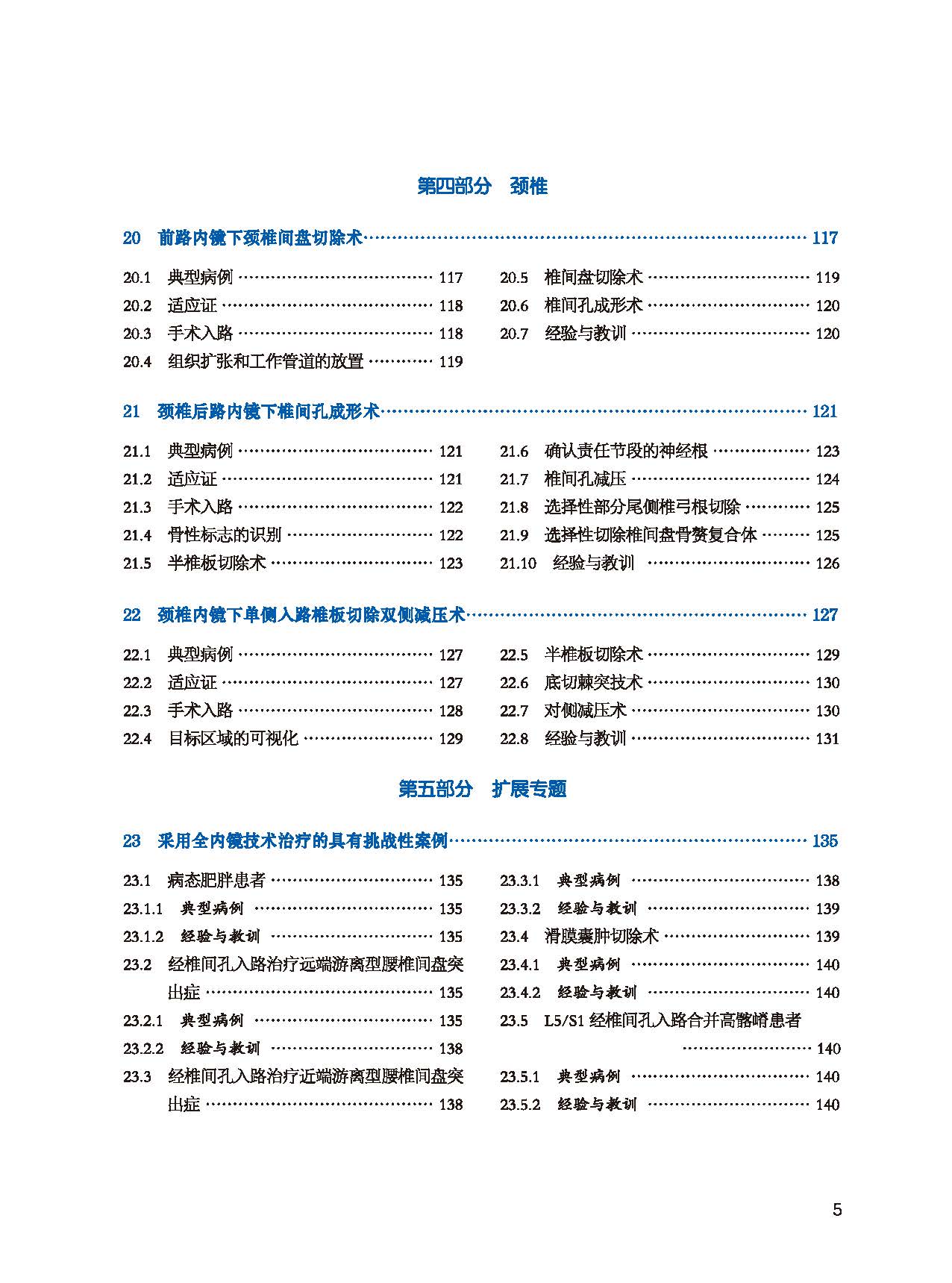 本書分為五部分,第一部分為基礎篇,介紹了內鏡脊柱手術的麻醉、設備、影像準備等;第二至第四部分按照腰椎、胸椎、頸椎部位分篇,以step-by-step的形式,詳細介紹了內鏡脊柱外科手術在脊柱各個部位的應用;複雜與疑難病例單獨分篇在第五篇介紹。附錄介紹了AO命名法,以規範內鏡脊柱外科手術的術語應用。