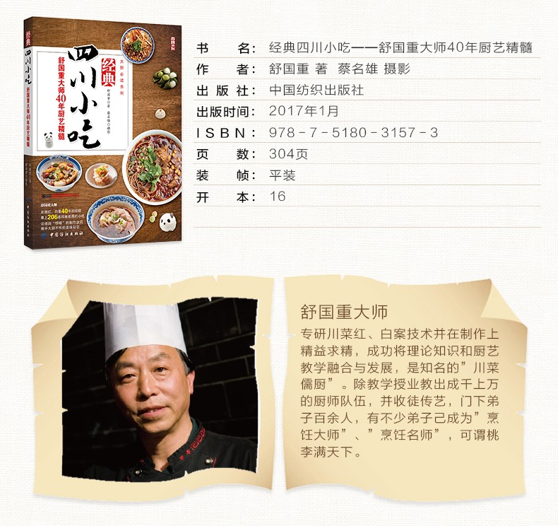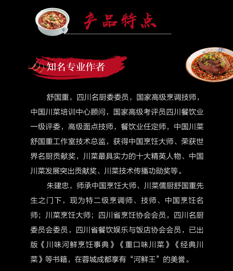 舒國重,四川名廚委委員,國家高級烹調技師,中國川菜培訓中心顧問,國家高級考評員四川餐飲業一級評委,高級麵點技師,餐飲業任定師,中國川菜舒國重工作室技術總監,獲得中國烹飪大師、榮獲世界名廚貢獻獎,川菜最具實力的十大精英人物、中國川菜發展突出貢獻獎、川菜技術傳播功勳獎等。