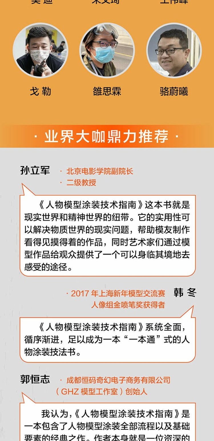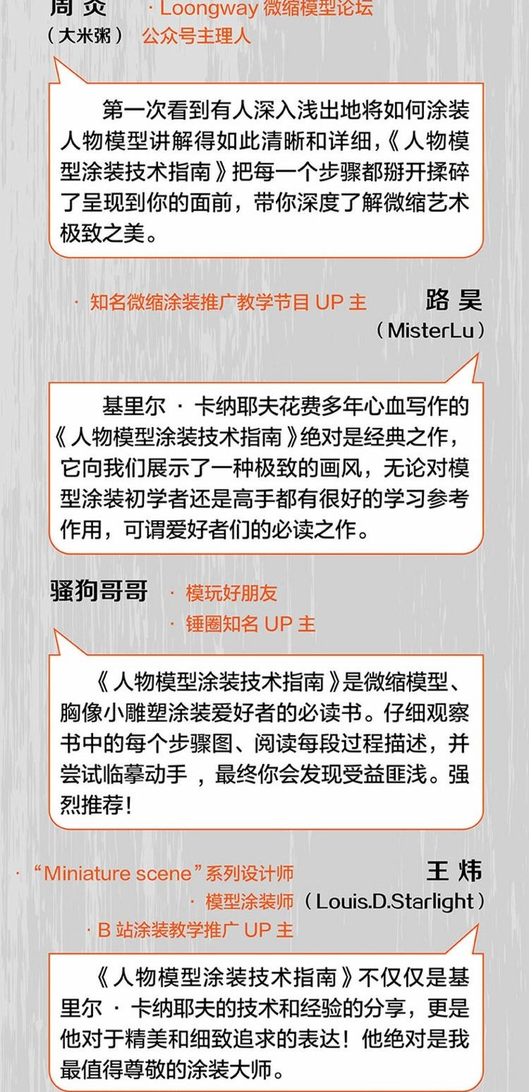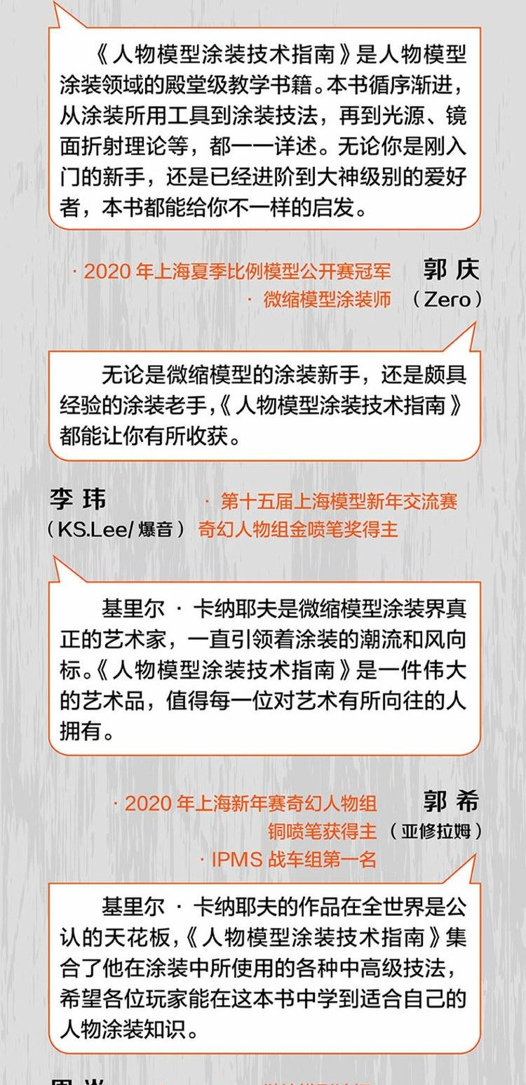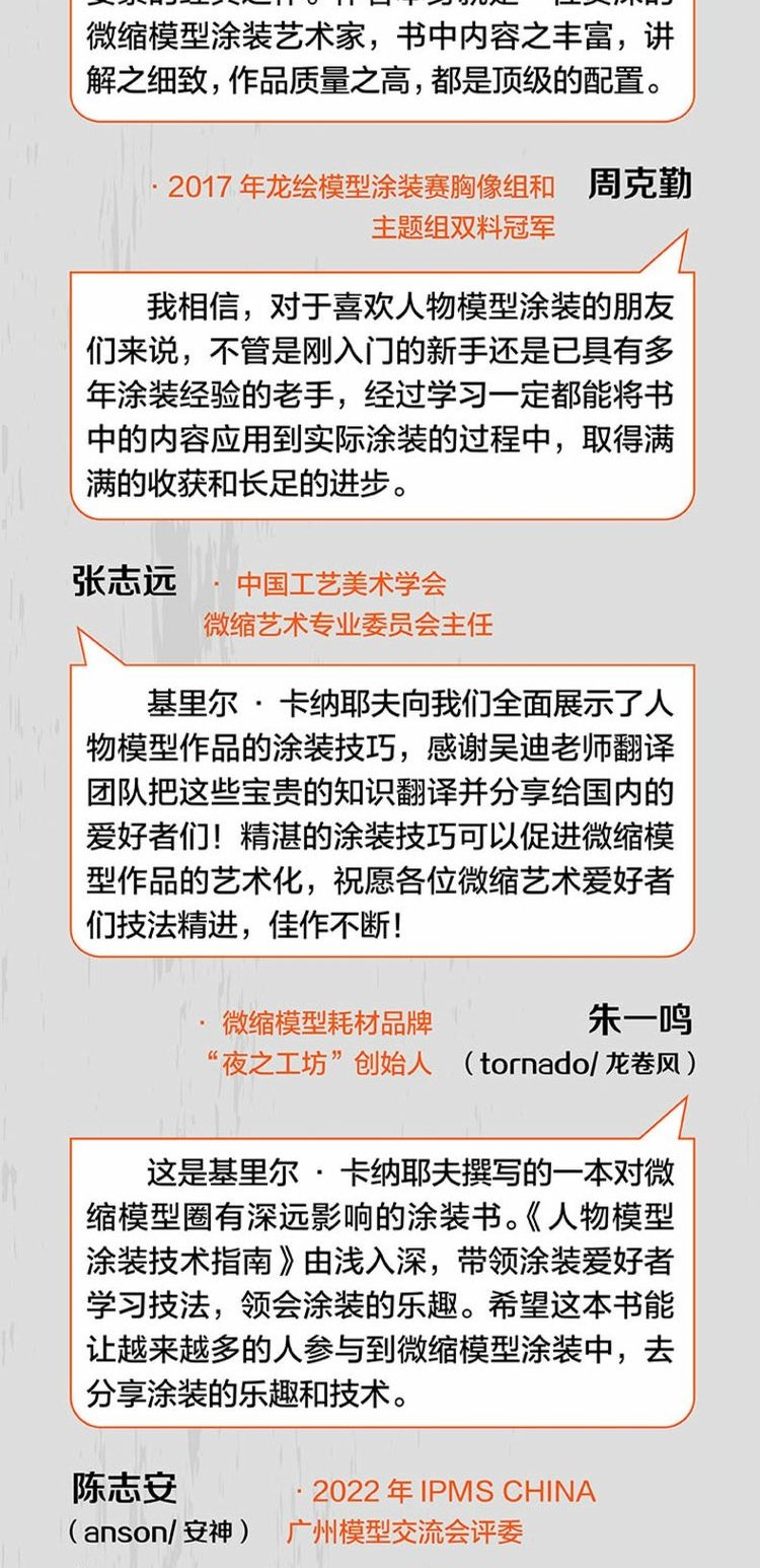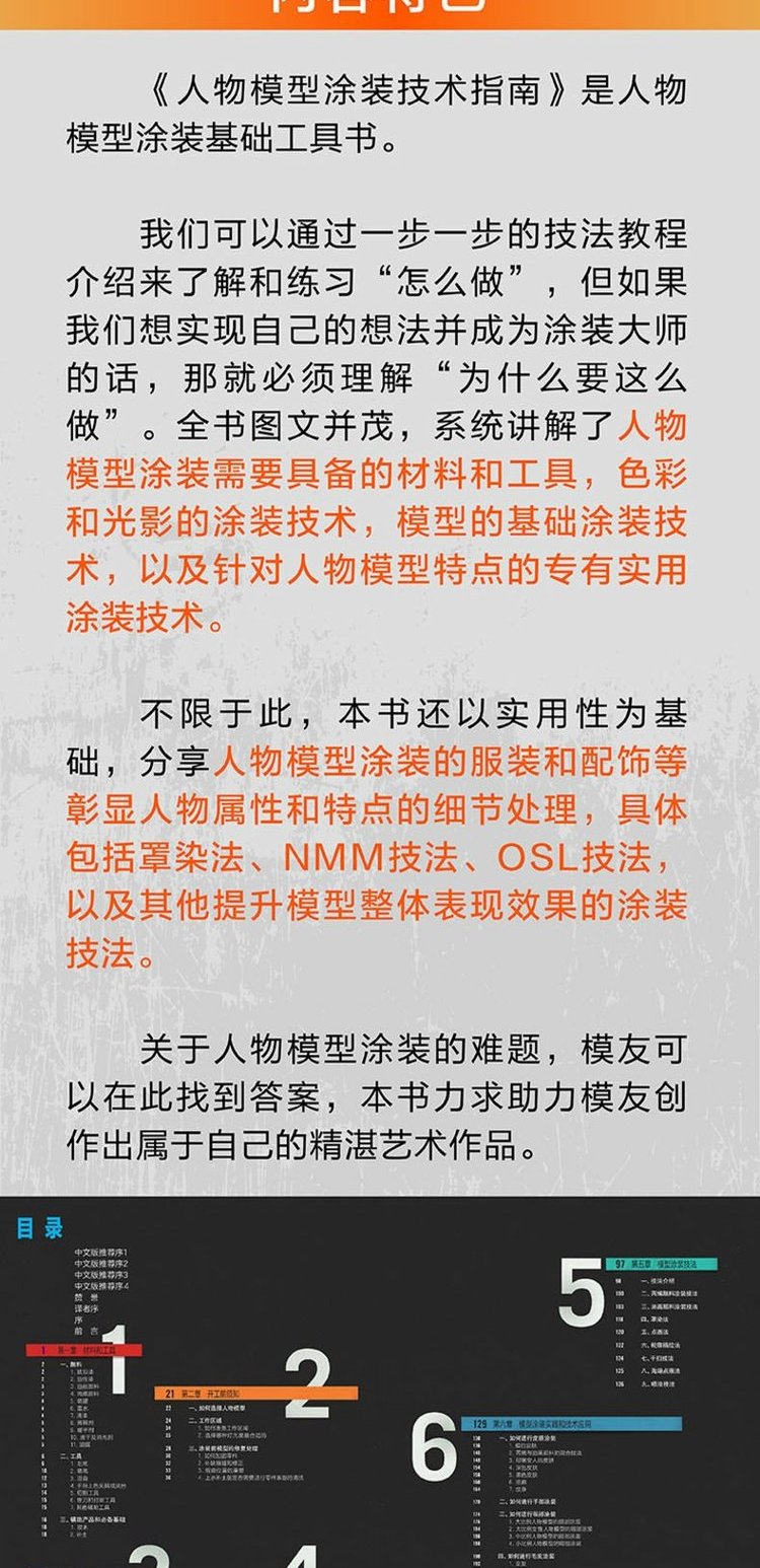 《人物模型塗裝技術指南1:塗裝基礎與實用技法》是人物模型塗裝基礎工具書。我們可以通過一步一步的技法教程介紹來了解和練習“怎麼做”,但如果我們想實現自己的想法並成為塗裝大師的話,那就必須理解“為什麼要這麼做”。全書圖文並茂,系統講解了人物模型塗裝需要具備的材料和工具,色彩和光影的塗裝技術,模型的基礎塗裝技術,以及針對人物模型特點的專有實用塗裝技術。關於人物模型塗裝的難題,模友可以在此找到答案,本書力求助力模友創作出屬於自己的精湛藝術作品。