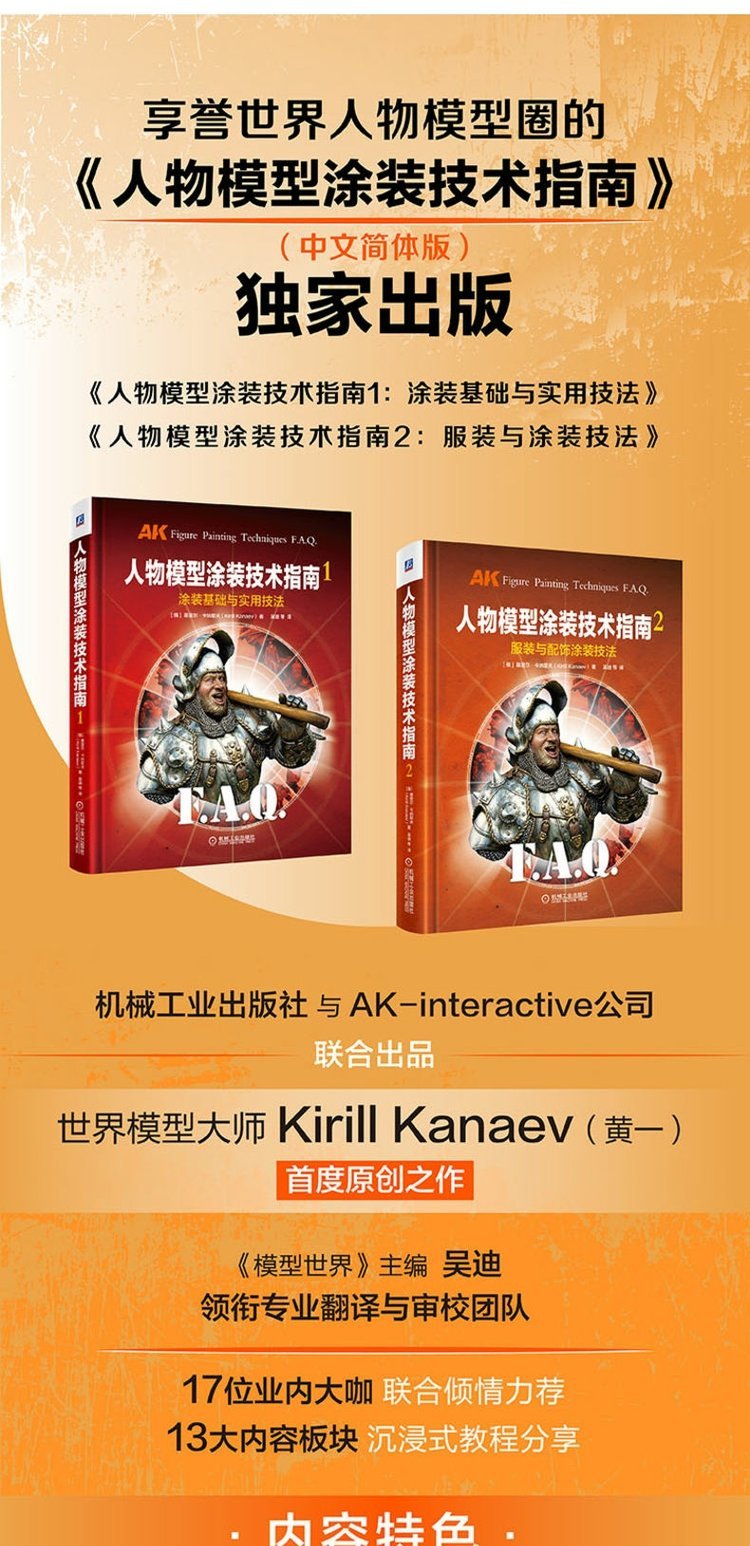 機械工業出版社與AK-interactive公司聯合出品 世界模型大師Kirill Kanaev(黃一)首度原創之作 《模型世界》主編吳迪領銜專業翻譯與審校團隊 17位業內大咖聯合傾情力荐 13大內容板塊沉浸式教程分享 《人物模型塗裝技術指南》是人物模型塗裝基礎工具書。我們可以通過一步一步的技法教程介紹來了解和練習“怎麼做”,但如果我們想實現自己的想法並成為塗裝大師的話,那就必須理解“為什麼要這麼做”。全書圖文並茂,系統講解了人物模型塗裝需要具備的材料和工具,色彩和光影的塗裝技術,模型的基......
