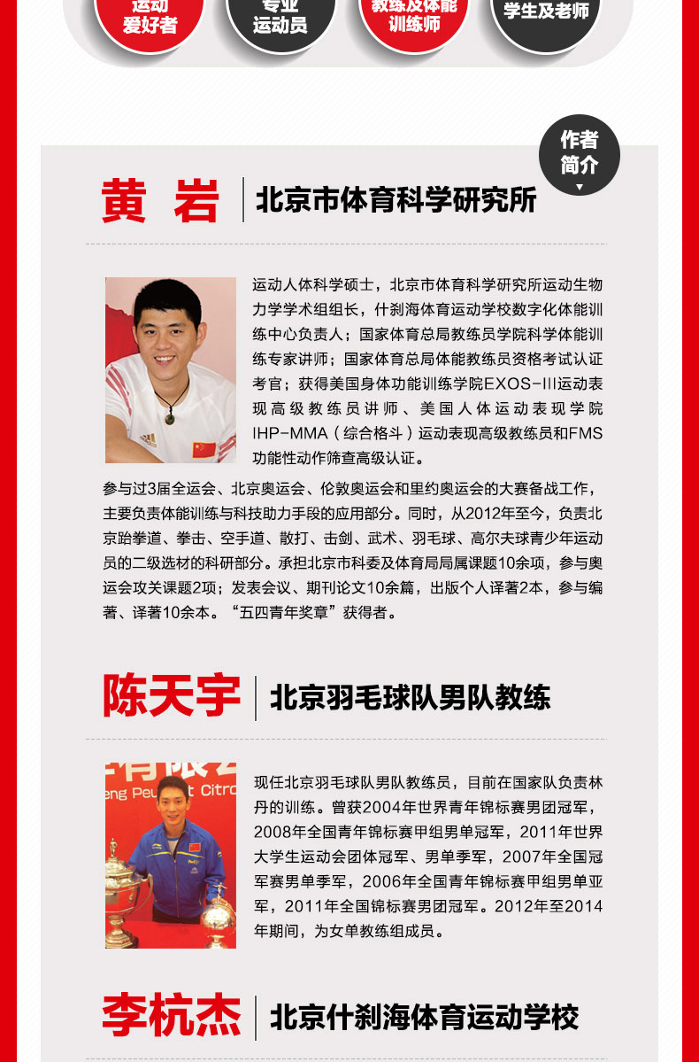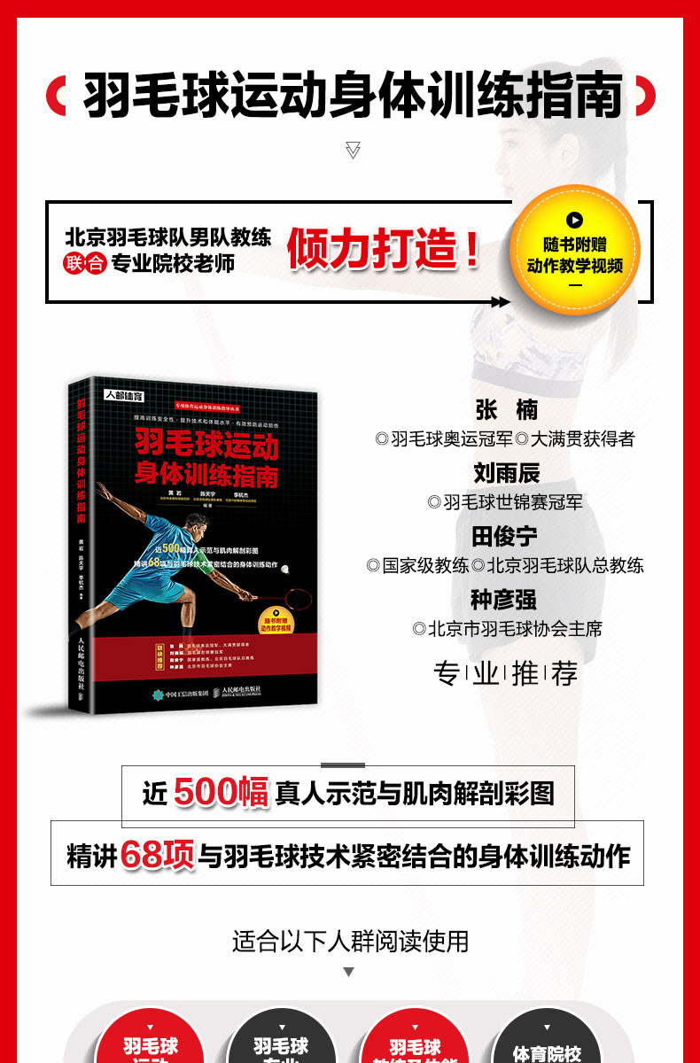 張 楠 羽毛球奧運冠軍、大滿貫獲得者 劉雨辰 羽毛球世錦賽冠軍 田俊寧 重量教練、北京羽毛球隊總教練 種彥強 北京市羽毛球協會主席 專業推薦!北京羽毛球隊男隊教練聯合專業院校老師傾力打造!近500幅真人示範與肌肉解剖彩圖 精講68項與羽毛球技術緊密結合的身體訓練動作 隨書附贈動作教學視頻!結合動作指導視頻學習,輕鬆提高運動表現!