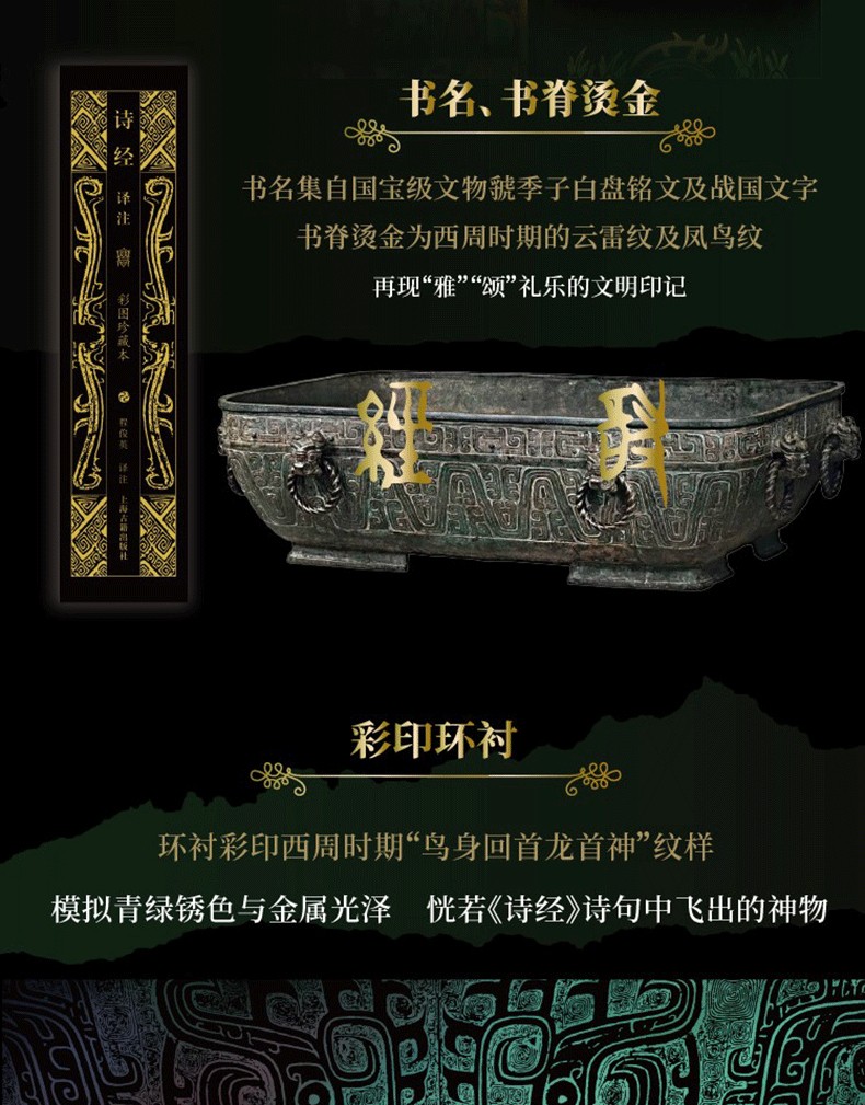 書名燙金「詩經」集自國寶級文物虢季子白盤銘文,虢季子白盤可與《詩經》所記之《採薇》《出車》《六月》等篇目相印證,具有極高的史學價值與美學意涵。