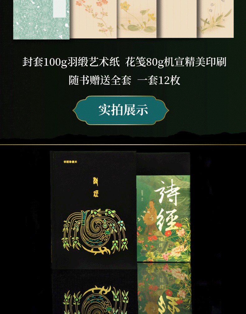 《詩經譯註》是由程俊英教授編著的全譯本。也是許淵沖先生《詩經》英譯本的首選底本。本書為《詩經譯註》彩圖特裝典藏版,採用“煙霞絨”布面精裝,以三色彩燙工藝呈現西周時期的“垂冠鳳鳥紋”,書名“詩經”集自國寶級文物虢季子白盤銘文,書脊採用雲雷紋及鳳鳥紋燙金裝飾,環襯為「鳥身回首龍首神」紋樣,護封融合《詩經》中的鳥獸草木、商末周初的父乙觥等歷代圖像及文物元素,生動展現《詩經》文化的源遠流長與藝術嬗變。全書包括原文、譯文、註釋、前言、題解、注音、彩圖、圖釋、地圖。原詩、譯文、註釋「三位一體」的版式,頗便閱讀。內文收錄《詩經》動植物圖、南宋馬和之《詩經圖》及諸侯國地理位置圖共250餘幅彩圖,配以2萬餘字圖釋,其中包括《詩經名物圖解》中未見的30餘幅彩圖,讀者可大飽眼福。另有14幅精美《詩經》地理位置示意圖,詳析諸侯國背景及古今地理關係。程俊英先生筆下的《詩經》白話譯詩清麗雋永,詩味濃鬱,具有女學者獨有的浪漫韻味,不論是十五國風中家喻戶曉的詩句,還是二雅三頌中語言艱澀的詩篇,通新世實英先生富有節奏的白話詩翻譯,西周閔神的真實生活與新世界的真實事物。隨書附贈喜馬拉雅獨家全書誦讀