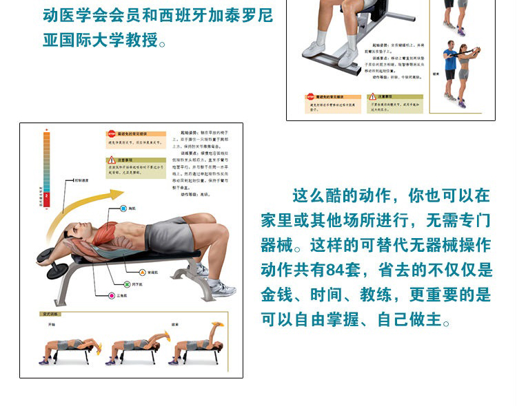 無器械力量訓練彩色圖譜 是一本完整的無器械力量訓練可視化指南,共包括50個涉及胸部、背部、肩部、手臂、腹部、臀部和腿部的基本訓練動作。針對每一個訓練動作都用圖示的方式進行展示,並詳細介紹了重點鍛煉的身體部位、準備姿勢、肌肉強度等,尤其是為不同水平的訓練者所設計的簡易版變式和進階版變式。在本書zui後部分,還給出了分別適合初級訓練者、中級訓練者和高 級訓練者的訓練方案。利用本書所介紹的方法,無需專門器械即可在家庭、辦公室以及其他場所進行卓有成效的訓練。