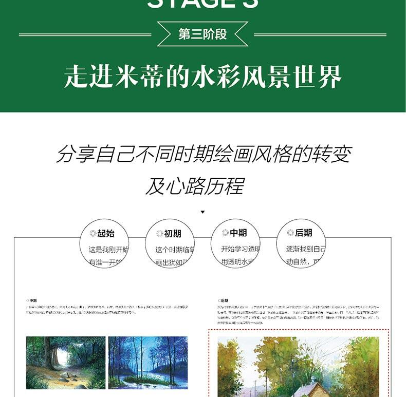 本書是水彩風景自學教學。在繪畫工具、技法、經驗上進行了全方位的深度剖析,是作者7年自學經驗的一個總結。書中用到了大量的案例和視頻教程,知識點很密集,按照自學的進程全書分成:基礎知識、進階技法、走進米蒂的水彩風景世界和寫生課四個不同的階段,用圖文結合的形式循序漸進地帶你走進水彩風景的世界,在講解技法的同時作者還分享了自己的自學經驗和心路歷程,更懂大家所能遇到的問題和瓶頸,是初學者的不二之選。