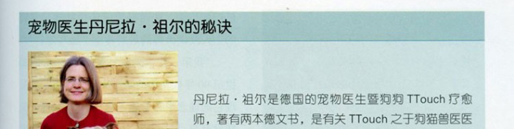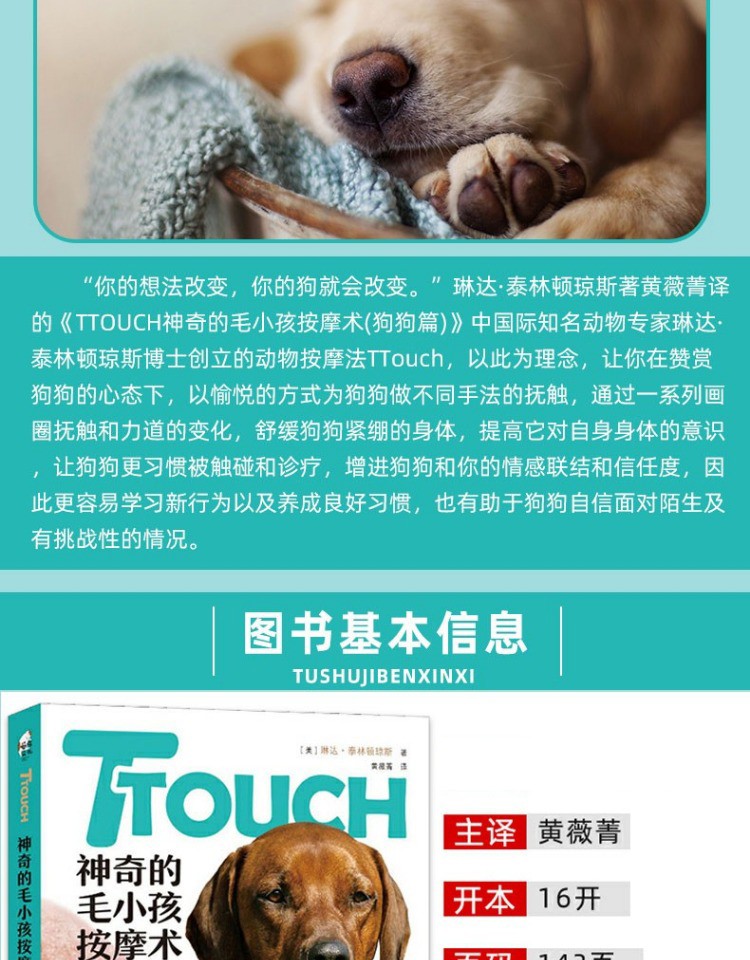 琳達‧泰林頓瓊斯著黃薇菁譯的《TTOUCH神奇的毛小孩按摩術(狗狗篇)》講述的TTouch是一種溫和尊重的訓練方法,能夠提升動物的健康和性情,並發展人與動物之 間的信任關係。 訓練是為了能讓動物與人類更舒適自在地生活,TTouch以此為目的,不僅關注動物的行為,更著眼於動物的身體健康以及性格的發展,力求讓動物的表現得到整體的提升。 而整個的過程,由於使用充滿尊重、非常溫和的TTouch方法,使我們與動物的信賴關係也得到提升。