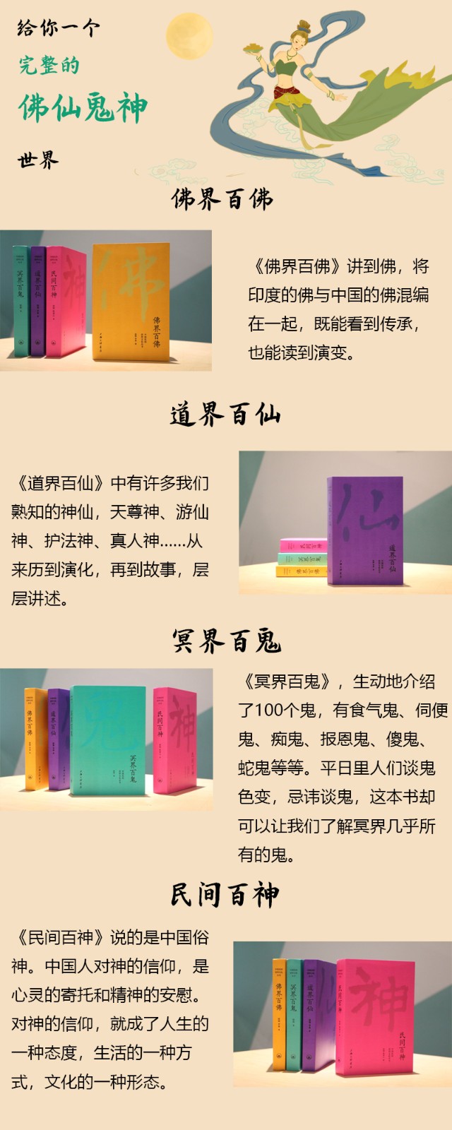 《佛界百佛》透過對佛教中100位神仙地梳理,向讀者展現了中國神仙文化的重要部分。中國神仙文化是中國傳統文化重要組成部分。全書寫作嚴謹,引用、註釋詳盡,兼具知識與趣味性。