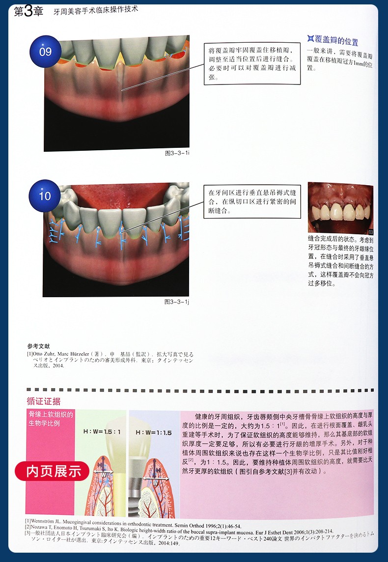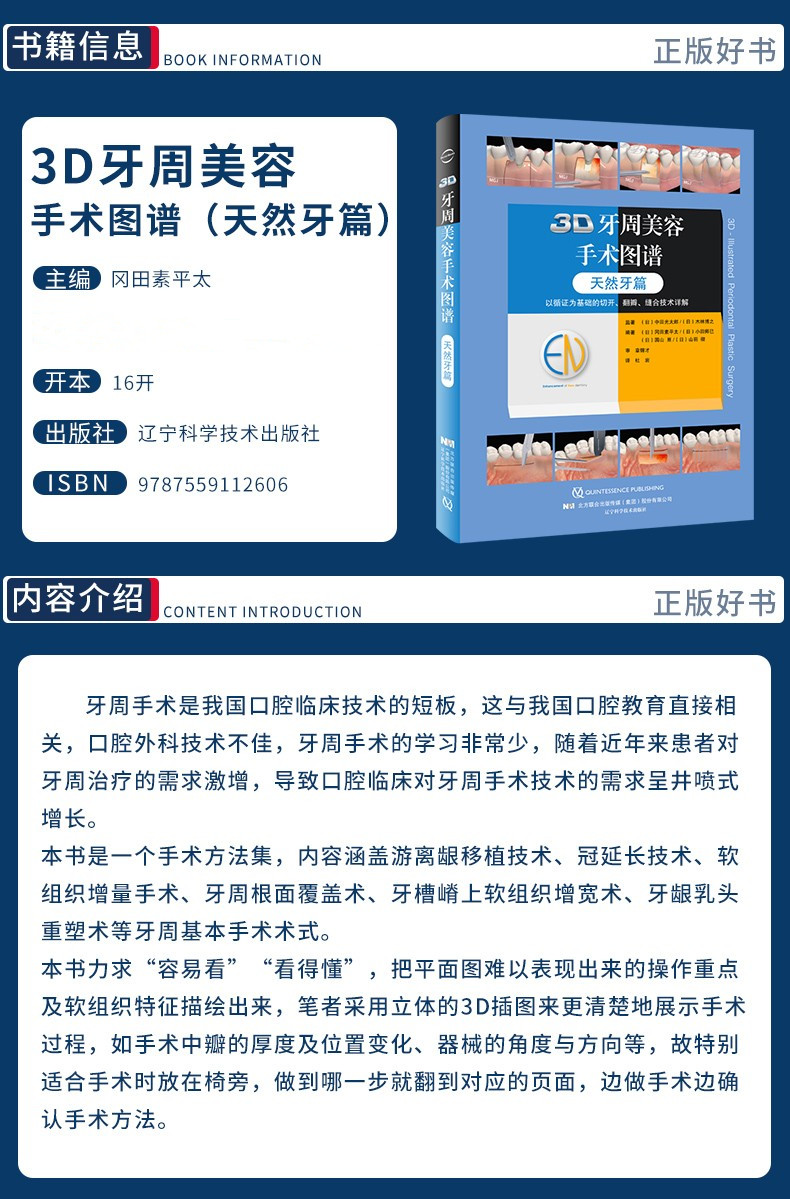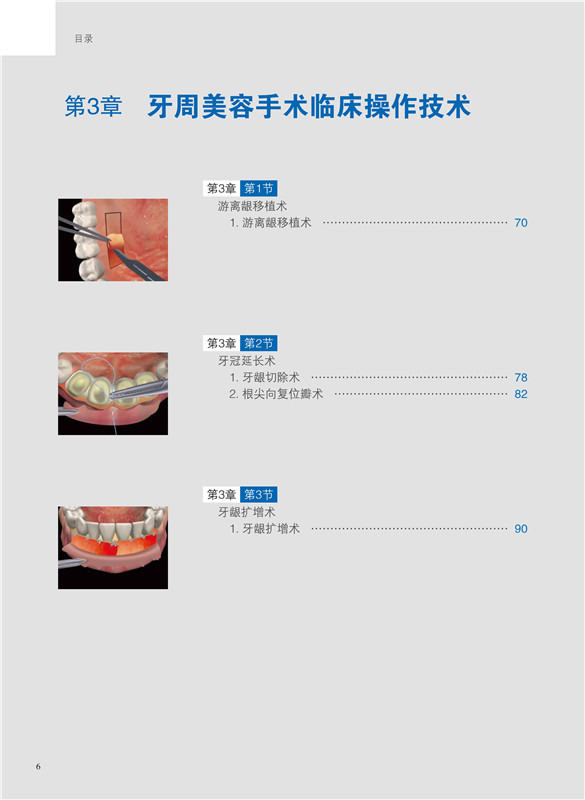 本書是一個手術方法集,內容涵蓋游離齦移植科技、冠延長科技、軟組織增量手術、牙周根面覆蓋術、牙槽脊上軟組織增寬術、牙齦乳頭重塑術等牙周基本手術術式。