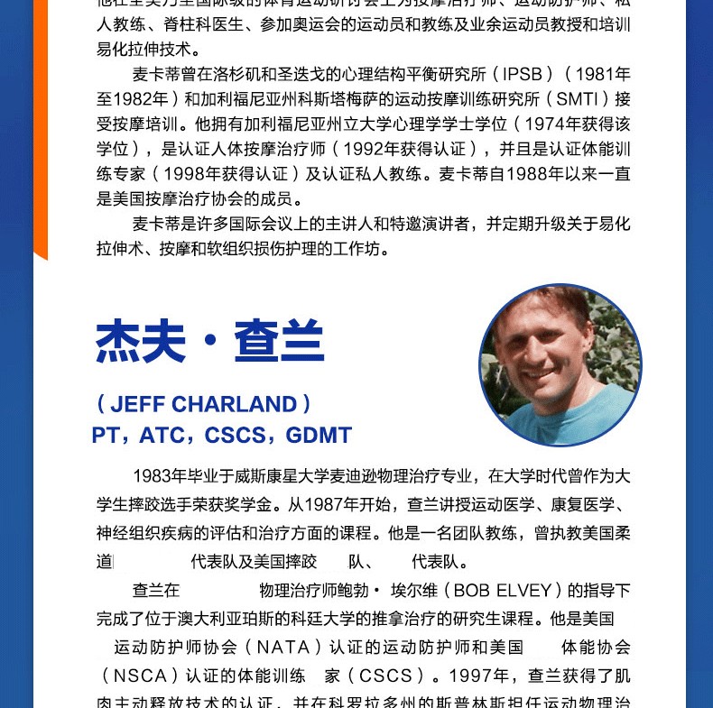 BA,LMT,CSCS,C-PT,1981年成為一名運動按摩治療師,專門從事運動和矯形按摩治療工作。自1988年以來,他一直在科羅拉多州的斯普林斯積極從事國際運動按摩工作。