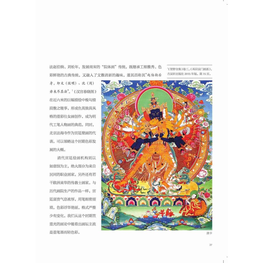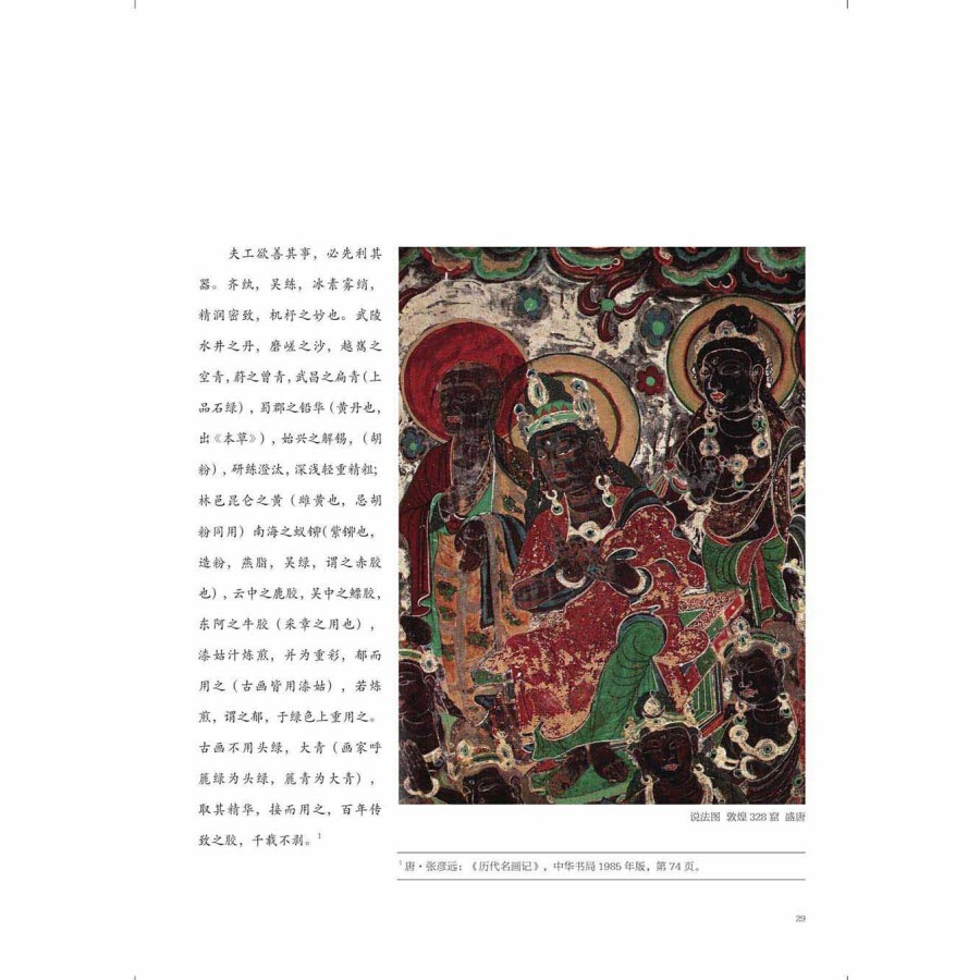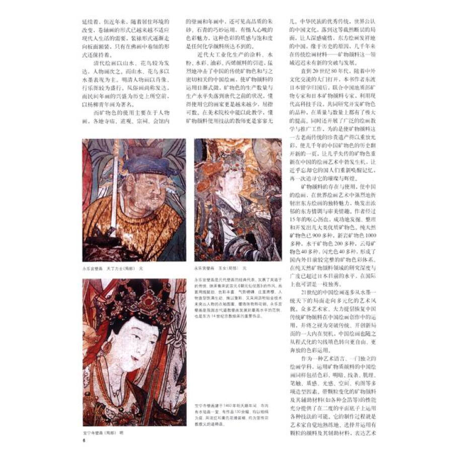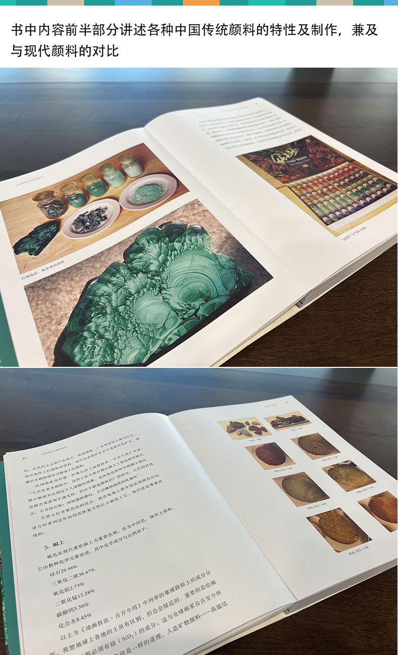 書中內容前半部分講述各種中國傳統顏料的特性及製作,兼及與現代顏料的對比;後半部分結合作者自己和當代十三位具有代表性畫家的繪畫創作,講述了顏料和工具材料的使用;最後梳理了中國重彩畫近幾十年的發展大事記。