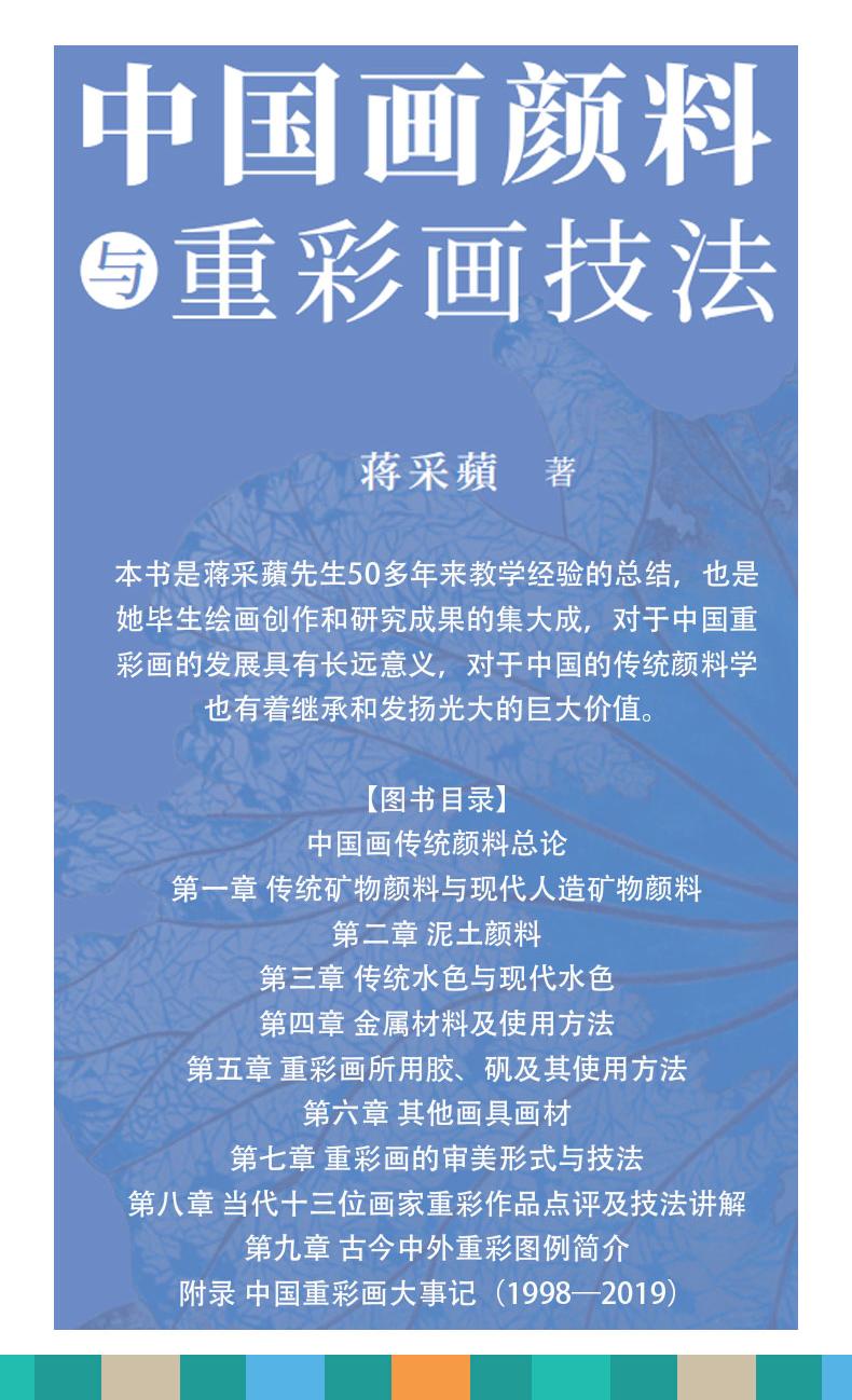 《中國畫顏料與重彩畫技法》是蔣採蘋先生50多年來教學經驗的總結,也是她畢生繪畫創作和研究成果的集大成,對於中國重彩畫的發展具有長遠意義,對於中國的傳統顏料學也有著繼承和發揚光大的巨大價值。