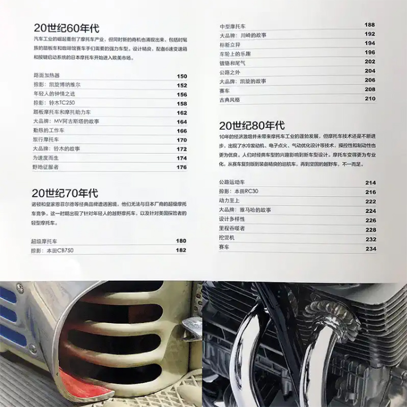 《摩托車全書》把摩托車發展的各個歷史時期濃縮成精煉的文字,配合精彩的照片和檔案,融會成一部摩托車通史。這本書既有摩托車的精彩往事掌故,也有對於摩托車設計細節的精闢描述,無論對於歷史愛好者還是對於技術痴迷者都是很好的讀物。