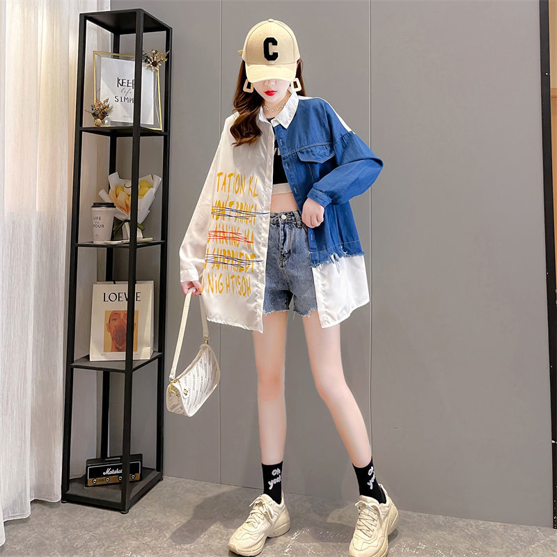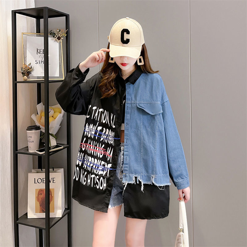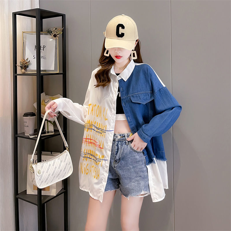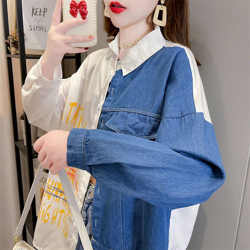 韓版設計感牛仔拼接薄款襯衫 新款寬鬆大碼女裝上衣