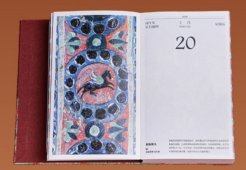 如是莫高,歲月凝光。璨然在壁,萬象奔來。敦煌研究院出品敦煌曆,2026年丙午馬年時序生輝。 甄選收錄335幅高清壁畫、30幅專家臨摹作品,特別選輯過往未公開的清晰細節。窮天下諫詭,盡人間麗飾。看天衣飛揚,滿壁風動,看琵琶弦上,落花成雨,看經變莊嚴,供養虔誠,看樂舞翩躚,法音繚繞,看菩薩低眉,金剛怒目,天女散花,力士擎天。 除夕日,莫高窟31窟《多寶塔》,聽塔鈴清響,新歲將至,圓滿遞增。 正月初一,莫高窟144窟《日天》,赤輪高懸,白馬踏春,日神乘坐五馬寶座,五駿馳騁,踏開一年新歲。 2 正月初五,榆林窟15窟《吐蕃財神》,瓔珞掛身,寶雨盈庭。 寒衣節,莫高窟202窟《樹上生衣》,願寒衣化暖,歲月生春。 冬至日,莫高窟156窟《舞樂圖》,瑞雪護佑,照破歲寒。 …… 既有佛國淨土,也繪人間百相。駝鈴叮咚,商賈往來雲集;青廬帳下,新人共牢而食;庖廚騰香,樂舞催宴;獵騎如風,羽箭穿雲;百戲雜陳,萬......