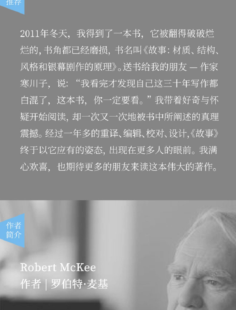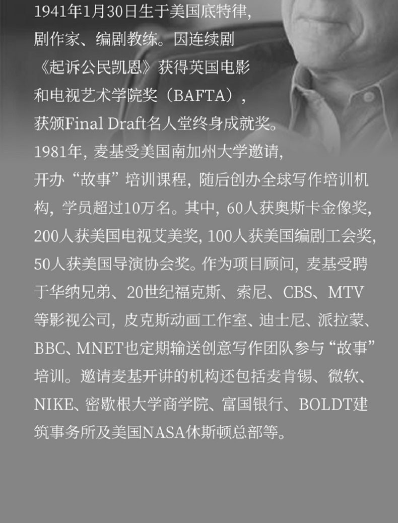 羅伯特·麥基 Robert McKee 生於1941年1月30日,劇作家。憑藉連續劇《起訴公民凱恩》獲得獲英國電影和電視藝術學院獎(BAFTA)。麥基多年來致力於在全世界講授“故事的藝術”。他的學員中,已有超過60人獲得奧斯卡金像獎,200人獲美國電視艾美獎,100人獲美國編劇工會獎,50人獲美國導演協會獎,以及普利策獎與布克獎。作為項目顧問,麥基受聘於華納兄弟、20世紀福克斯、索尼、CBS、MTV等影視公司,皮克斯動畫工作室、迪士尼、派拉蒙、BBC、MNET也定期輸送創意寫作團隊參與“故事”培訓。邀請麥基開講的機構還包括麥肯錫、微軟、NIKE、密歇根大學商學院、富國銀行、BOLDT建築事務......