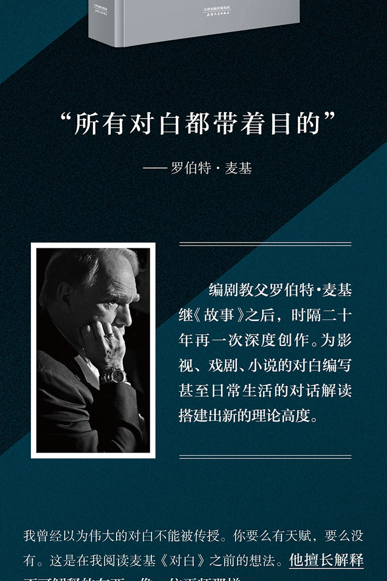 《對白(文字舞台銀幕的言語行為藝術)(精)》是美國電影教父羅伯特·麥基講述電影對白創作心得的作品,是作者繼《故事:材質、結構、風格和銀幕劇作的原理》後又一部新作。本書以一百多部影片作為示例,向讀者重新定義對白,講述對白的功能、表達內容、形式、技巧,對對白的修改提出指導,以生動的例子解析如何創造對白,本書對當代電影對白創作有一定的指導意義。