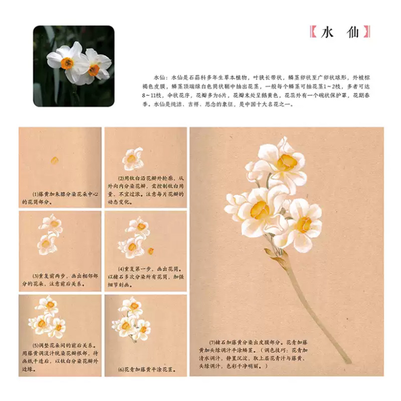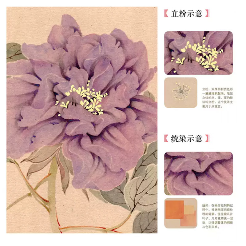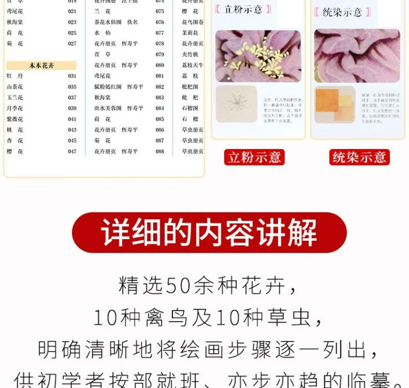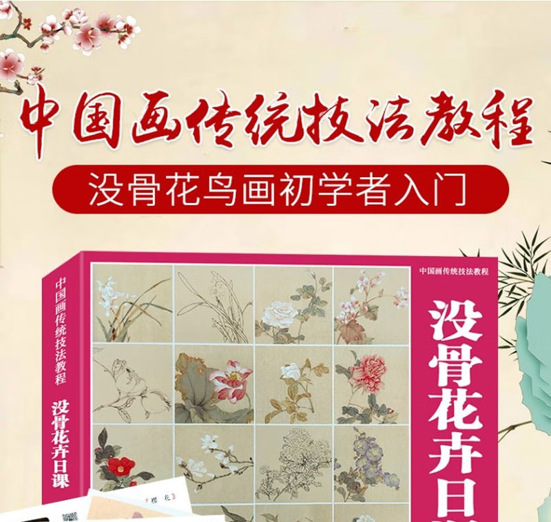 《中國畫傳統技法教程·沒骨花卉日課》是針對國畫初學者所策劃的一本沒骨花鳥畫技法書。 全書框架分概述、沒骨技法解析、草本花卉、木本花卉、禽鳥、草蟲及教學課稿七個部分。 其中沒骨技法解析、草本花卉、木本花卉、禽鳥、草蟲屬於技法講解部分,技法講解部分精選50餘種花卉,10種禽鳥及10種草蟲,並對每一種內容進行詳細的講解 。 每種內容的講解分花鳥介紹、相關畫稿、相關作品、分步驟講解及歷代沒骨花鳥名品賞析五部分。 教學課稿部分為技法講解部分相對應的畫稿及作品的原大排列,更方便讀者檢索、臨摹、學習。