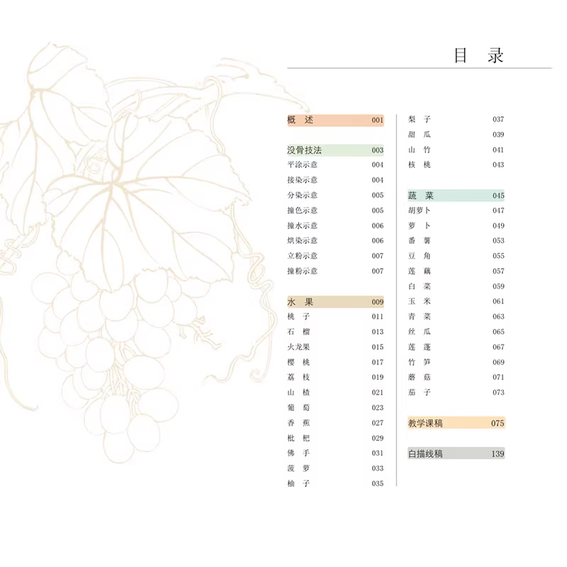 沒骨畫是中國傳統繪畫的一個門類,其技法簡便易學、畫面易出效果的特點,使得沒骨畫教程備受國畫初學者的青睞。本書是針對國畫初學者所策劃的一本沒骨畫技法書,全書分為技法講解及教學課稿兩部分。技法講解部分分為沒骨畫相關技法的講解以及生活中喜聞樂見的,帶有吉祥寓意的蔬果題材的沒骨繪製教程。講解著重於用色、造型特徵、構圖方式及學中的難點要點等。且每一題材的講解都配有完整的教學。教學課稿部分為技法講解部分所展示的課稿與白描稿,與原作等大,並與技法講解部分一一對應。且教學課稿部分做活頁處理,讓讀者學索、整理起來更加方便。
