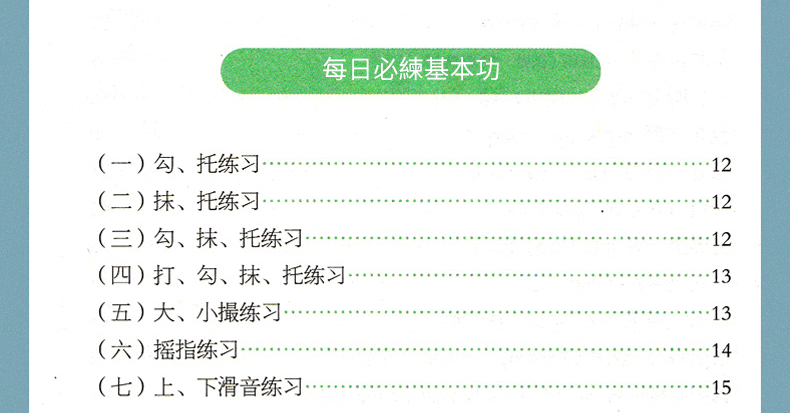 DY部分,訓練手指的彈奏能力,著重練習傳統指序和現代指序的各種不同運指的連接技術、變化指序與過弦方法,適合不同程度的演奏者。練習1~44,更適合初級和中級程度者,在學習掌握各種指法時,逐步提高手指基本能力;練習45~68,適合中級與高級程度的演奏者。對基本指法已經熟練掌握的演奏者而言,可以集中、有效地解決箏曲中特定的運指、連接和過弦方法的技術難點。