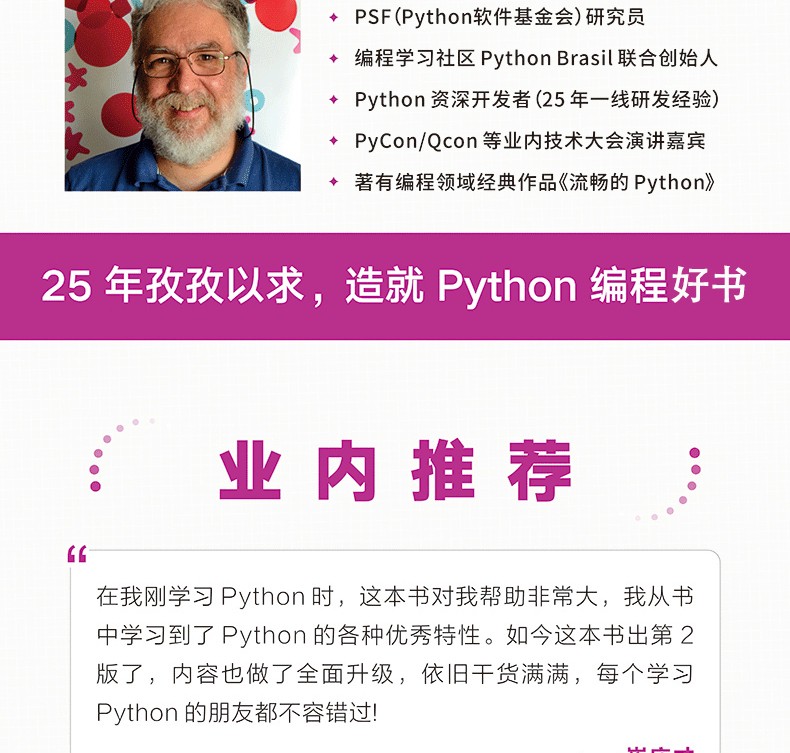 本書是Python領域備受推崇的經典作品,致力於幫助Python開發人員挖掘這門語言及相關程序庫的優秀特性,寫出簡潔、流暢、易讀、易維護,並且地道的Python代碼。本書著重講解Python語言所獨有的功能,助你成功進階為Python高手。第2版與時俱進,教你跳出舊有經驗,探索並運用地道的Python3功能。第2版主體內容分為五部分:數據結構、函數即對象、類和協議、控制流、元編程。每一部分都精彩紛呈,通過豐富的示例和細緻的講解,教你充分利用Python特性,寫出有效且現代的Python3代碼。對於所有想提升Python開發技能的讀者,本書不容錯過。