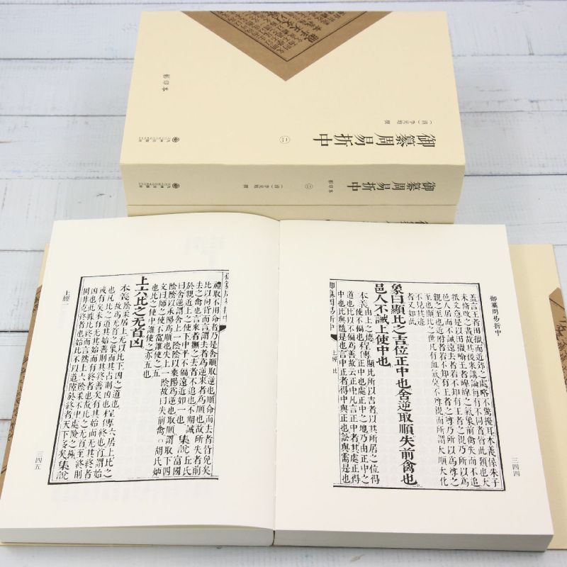 御纂周易折中》乃「御纂七經」之第一部,成書於清康熙五十四年。本書由康熙皇帝下詔編纂,文淵閣大學士李光地總裁修訂,共輯錄二百一十八位易學名家之說,上自漢晉,下止元明,使二千年易道淵源皆可覽見。作為清代官方易學的集大成之作,本書自問世後,便作為士子讀易的欽定教科書而頒賜各級學校,流傳甚廣。