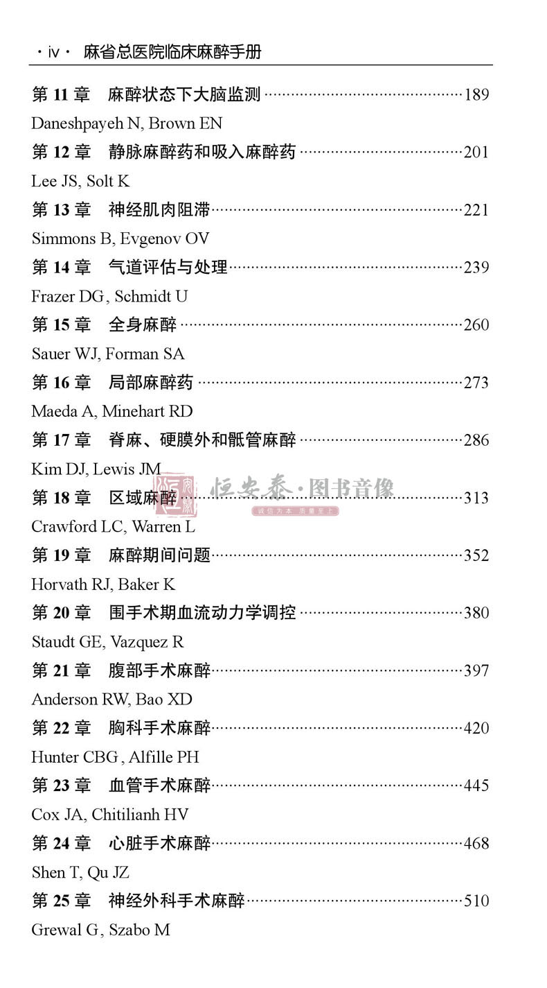 美國Handbook of Clinical Anesthesia Procedures of the Massach- usetts General Hospital一書,是由美國麻省總醫院麻醉科醫師編寫,其自第1版(1978年)出版40年來,不斷更新再版,現已出第9版。本書為原書第9版中文翻譯版,其內容在第8版基礎上進行了相應的章節調整:“門診手術麻醉”一章內容刪除,增加了“麻醉狀態下大腦的監測”和“脊柱外科手術麻醉”兩章;將“新生兒急症手術麻醉”改為“新生兒的管理”;將“圍手術期呼吸衰竭”改為“手術後肺部並發症”;其他章節也進行了增減修改。