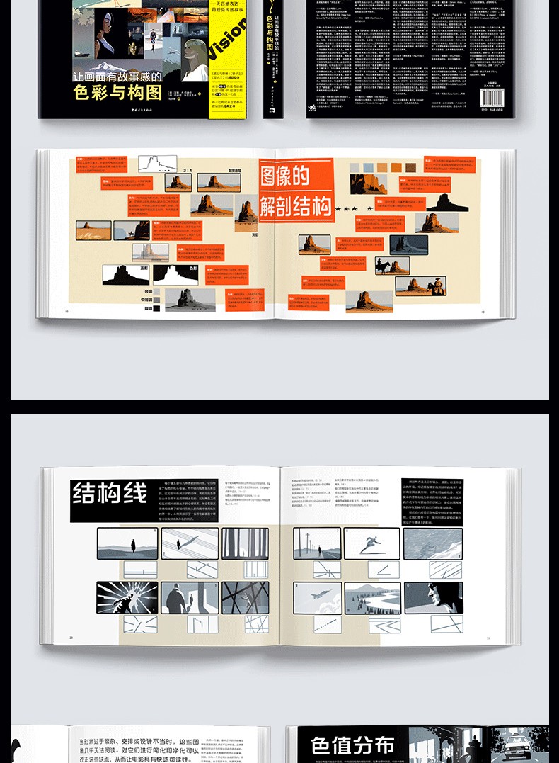 ① 8個章節分模塊講解視覺元素-影像心理學、線條、形狀、色值、色彩、光、攝影機、構圖;