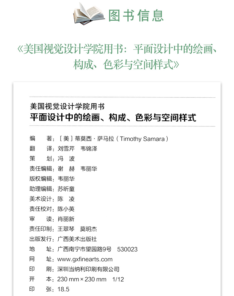 《美國視覺設計學院用書:平面設計中的繪畫、構成、色彩與空間樣式》對於想要把繪畫作為一種創意工具的各級設計學生和從業人員而言都是一本全面的必備參考書。本書作者、設計師提摩西‧薩馬拉為讀者呈現了一幅廣闊而包羅萬象的繪畫圖景,包括圖像化再現、圖標標誌設計、地圖及圖表製作、圖形翻譯、非圖像抽象化、字體設計、拼貼以及排版,能幫助讀者將繪畫納入他們的設計語言中。