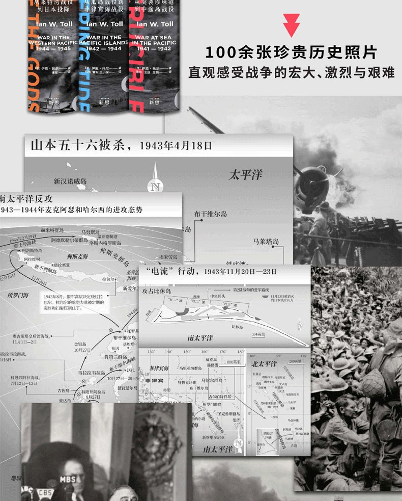 充分挖掘各類史料,公正還原歷史真相 托爾在原有太平洋戰史的基礎上,吸收新近公開或出版的檔案、紀實文獻、回憶錄和研究成果,大量引用親歷者的口述史、日記和書信,分析戰略和戰術決策時則會回顧海軍軍官的作戰報告和戰爭日誌。他在運用史料時也格外注意平衡呈現各方角度,盟軍和日軍、前線和後方、軍人和平民的視角交替出現,盡可能展示了複雜歷史的本來面目。