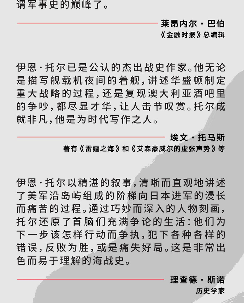 「太平洋戰爭三部曲」是21世紀太平洋戰爭史集大成之作,在美國收穫近90%讀者上千條五星好評,一度登上《紐約時報》非虛構作品榜,被譽為「軍事史的」《史詩般的軍事史鉅作》。