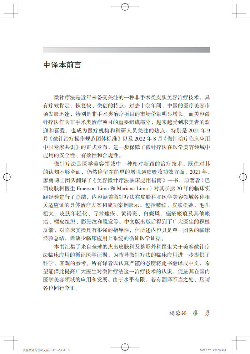 本書匯集了來自全球的傑出皮膚科及整形外科醫生關於美容微針療法臨床應用的循證醫學證據,為指導微針療法的臨床應用進一步提供了科學、客觀的參考。所有譯者以認真嚴謹的態度將此書翻譯成中文,希望能藉此提高廣大醫生對微針療法這一治療技術的認識,促進其在國內醫學美容領域的應用和發展。