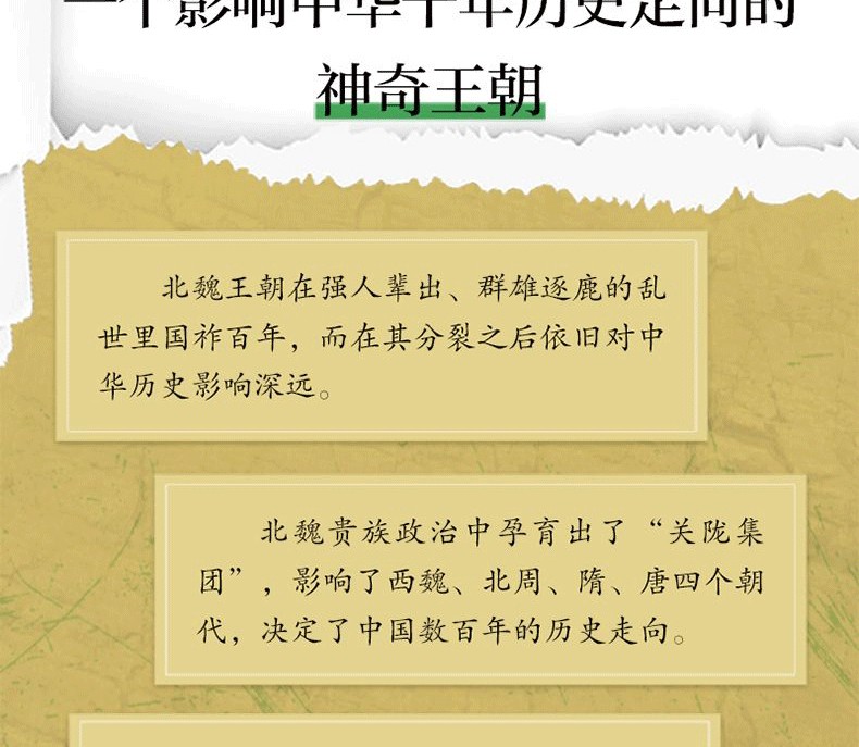 "★《百家講壇》知名主講人紀連海作序推薦,適合大眾讀者閱讀的北魏斷代史。 ★秦漢文明之餘韻,隋唐盛世之先聲——一段常被忽略的華麗篇章,一個影響中華千年曆史走向的神奇王朝。 ★中國歷史上DI一次民族大融合,開啟游牧與農耕兩種文明新格局。 ★從喪家之犬到中原霸主:曾在草原中落敗的拓跋部落,何以在南北朝的戰火中創立北魏,統治中國北方長達百餘年? ★北魏王朝一步步走向強盛的過程中,為什麼能鮮少犯錯?統治者的魄力抉擇、殘酷的繼承人制度如何避免了部落式的內鬥與政權分裂? ★戰爭......