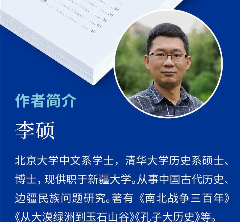 李碩,北京大學中文系學士,清華大學歷史系碩士、博士,現供職於新疆大學。從事中國古代歷史、邊疆民族問題研究。著有《南北戰爭三百年》《從大漠綠洲到玉石山谷》《孔子大歷史》等。