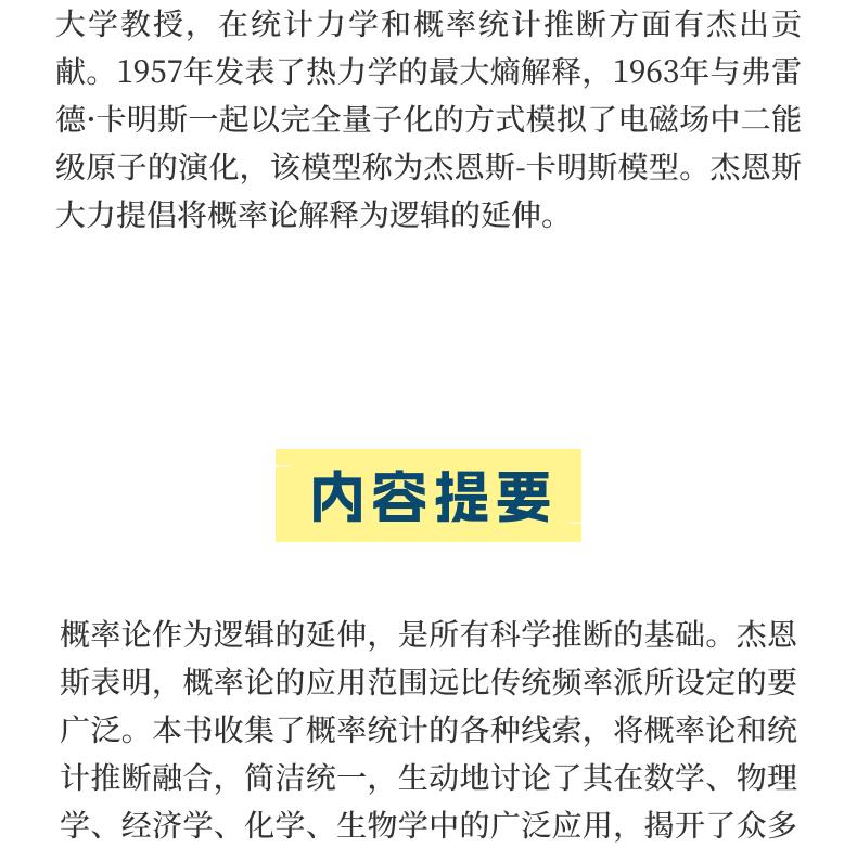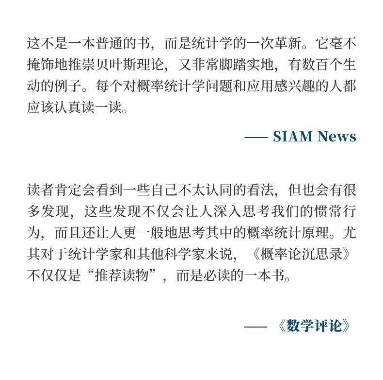 讀者肯定會看到一些自己不太認同的看法,但也會有很多發現,這些發現不僅會讓人深入思考我們的慣常行為,而且還讓人更一般地思考其中的機率統計原理。尤其對於統計學家和其他科學家來說,《機率論沉思錄》不僅僅是“推薦讀物”,而是必讀的一本書。