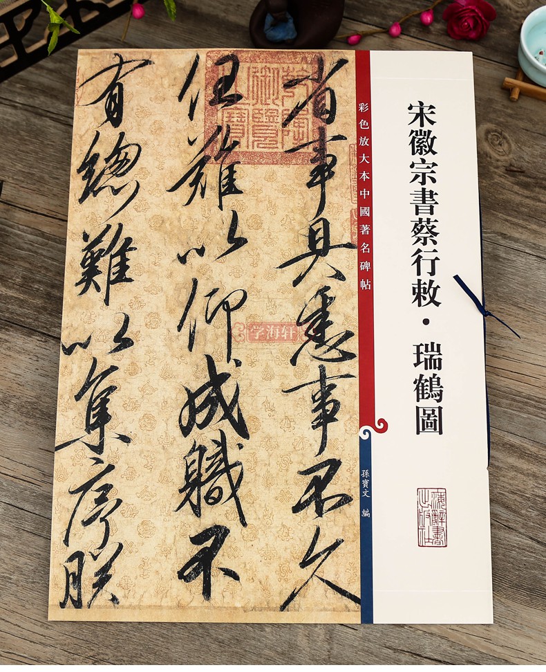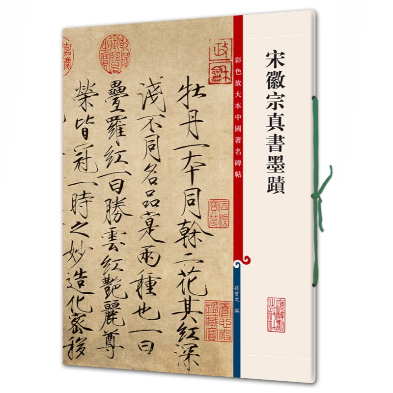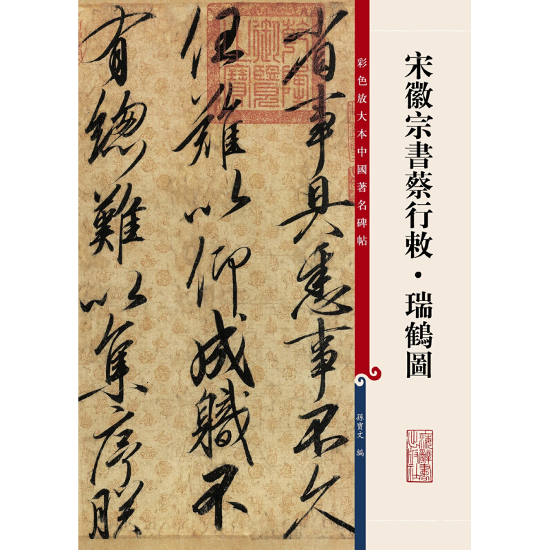 "彩色放大本中國碑帖"系列,底本好,印製精,大8開,為彩色放大本,並延請專家釋文,方便讀者研究學習,尤其適合書法愛好者對帖臨摹。本書為"彩色放大本中國碑帖"系列之一。 "在遼寧省博物館,藏有兩件宋徽宗趙佶珍跡。其行書蔡行敕卷,縱三十五點五厘米,橫二百一十四點六厘米。方家評說,這卷珍跡行間佈白疏朗得體,筆劃纖細,墨韻流暢,瀟灑清勁,有如飄藤盪柳之勢。另一卷是《瑞鶴圖》,此作書畫合璧,絹本,縱五十一厘米,橫一百三十八厘米。有方家稱道,其繪畫技法尤為精妙,圖中群鶴如雲似霧,姿態百變,無有同者。卷後瘦金書健筆開張,挺勁爽利,側峰如蘭竹,媚麗之氣溢出字裡行間。在上海博物館,藏有一件宋徽宗草書七言詩聯團扇,絹地,直徑二十八點四厘米。在台北故宮博物院,藏有一件《宋徽宗文會圖》,圖上有宋徽宗題寫的七言絕句。編者將上述四件珍跡略微放大印出,供廣大讀者欣賞、臨習。