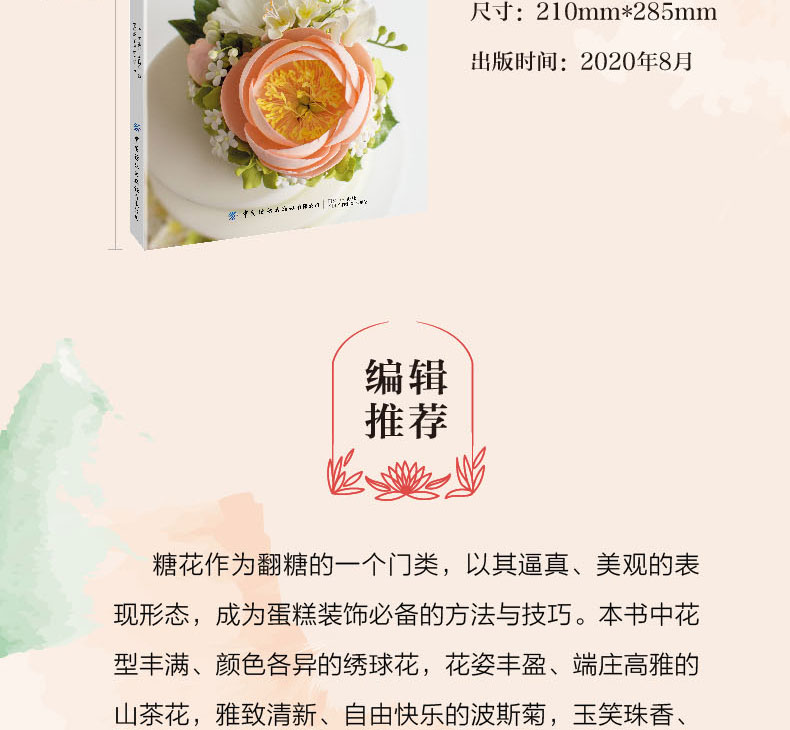 糖花作為翻糖的一個門類,以其逼真、美觀的表現形態,成為蛋糕裝飾推薦的方法與技巧。本書中花型豐滿、顏色各異的繡球花,花姿豐盈、端莊高雅的山茶花,雅緻清新、自由快樂的波斯菊,玉笑珠香、富麗堂皇的牡丹以及充滿浪漫氣息的薰衣草……這些色彩鮮明、形態逼真的糖花盡情“綻放”,在蛋糕裝飾上大放異彩。除了蛋糕裝飾,還特別介紹了婚禮蛋糕的裝飾方法,給人以聖潔而愉悅的感覺,是一本非常實用的糖花裝飾蛋糕的工具書。